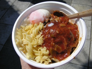 ごはん+パスタ+ハンバーグなので腹にたまる。